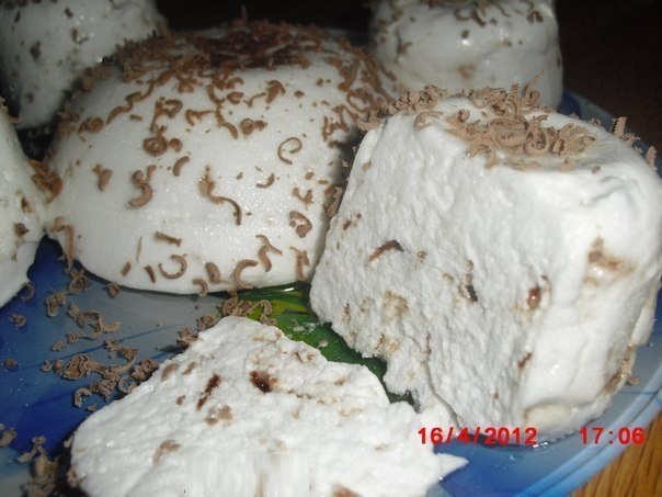 .Ингредиенты: на 2 большие порции 2 белка (65 г) 30 г сахара 20 г рубленного шоколада Приготовление: Белки нужно взбить на средней скорости до мягких пиков, постепенно добавить сахар, увеличить скорость и продолжать взбивать до тех пор, пока белки не станут блестящими и не будет формировать уверенные "твердые пики".