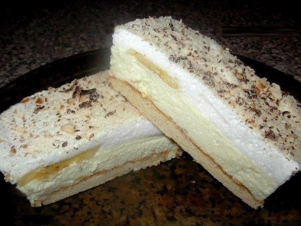 Для первого слоя взбить 5 желтков и 200 грамм сахара, добавить мягкое масло, творог, все очень хорошо взбить. Если творог с комочками, его измельчить в блендере, иначе не получится кремообразная масса. Вылить в смесь желатин из первой чашечки (в которой его больше) и слегка все взбить. Для второго слоя взбить 5 белков в пену, всыпать по частям сахар, добавить ванилин и продолжить взбивать. Вылить желатин из второй чашечки и немного взбить смесь.
